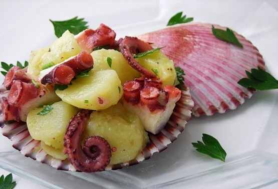 Terwijl de octopus kookt, kunt u de vinaigrette bereiden door het volgende in een potje of plastic bakje te doen: ½ kopje goede olijfolie, 4-5 eetlepels witte wijnazijn, twee geplette knoflookteentjes, zout en gemalen peper naar smaak . Sluit het deksel en schud, schud, schud om te mengen.