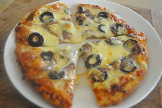 Bedek met kaas, ansjovis en olijven, besprenkel de olie over de bovenkant.