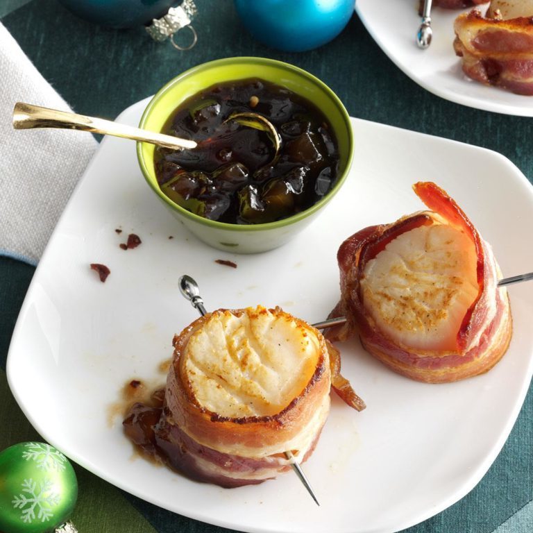 Wikkel een spekstrook rond elke Sint-jakobsschelp; Zet ze vast met tandenstoker. Verzacht zout en peper. Bak in een grote koekepan met spek omwikkelde Sint-Jakobsschelpen in olie op middelhoog vuur gedurende 5-7 minuten of tot sint-jakobsschelpen stevig en ondoorzichtig zijn, eenmaal draaien. Bewaar met perensaus.