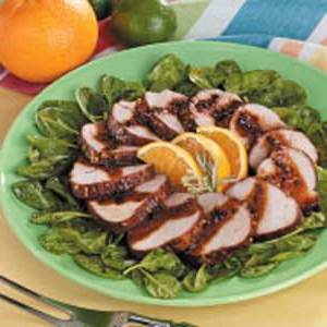 Gooi spinazie met vinaigrette. Bak spinazie op vier saladeplaten; top met gesneden varkensvlees. Roer met pan-sappen.