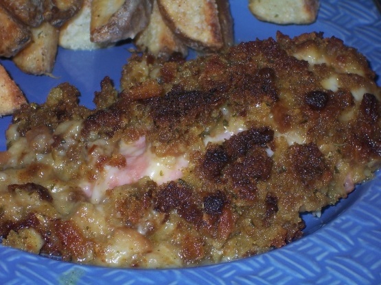 Laag in ovenschaal: kip, dan ham.