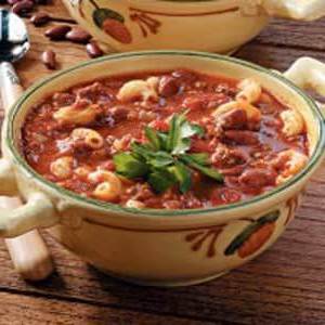 Voeg de bonen en macaroni toe; Laat het 15-20 minuten langer sudderen tot macaroni gaar is.