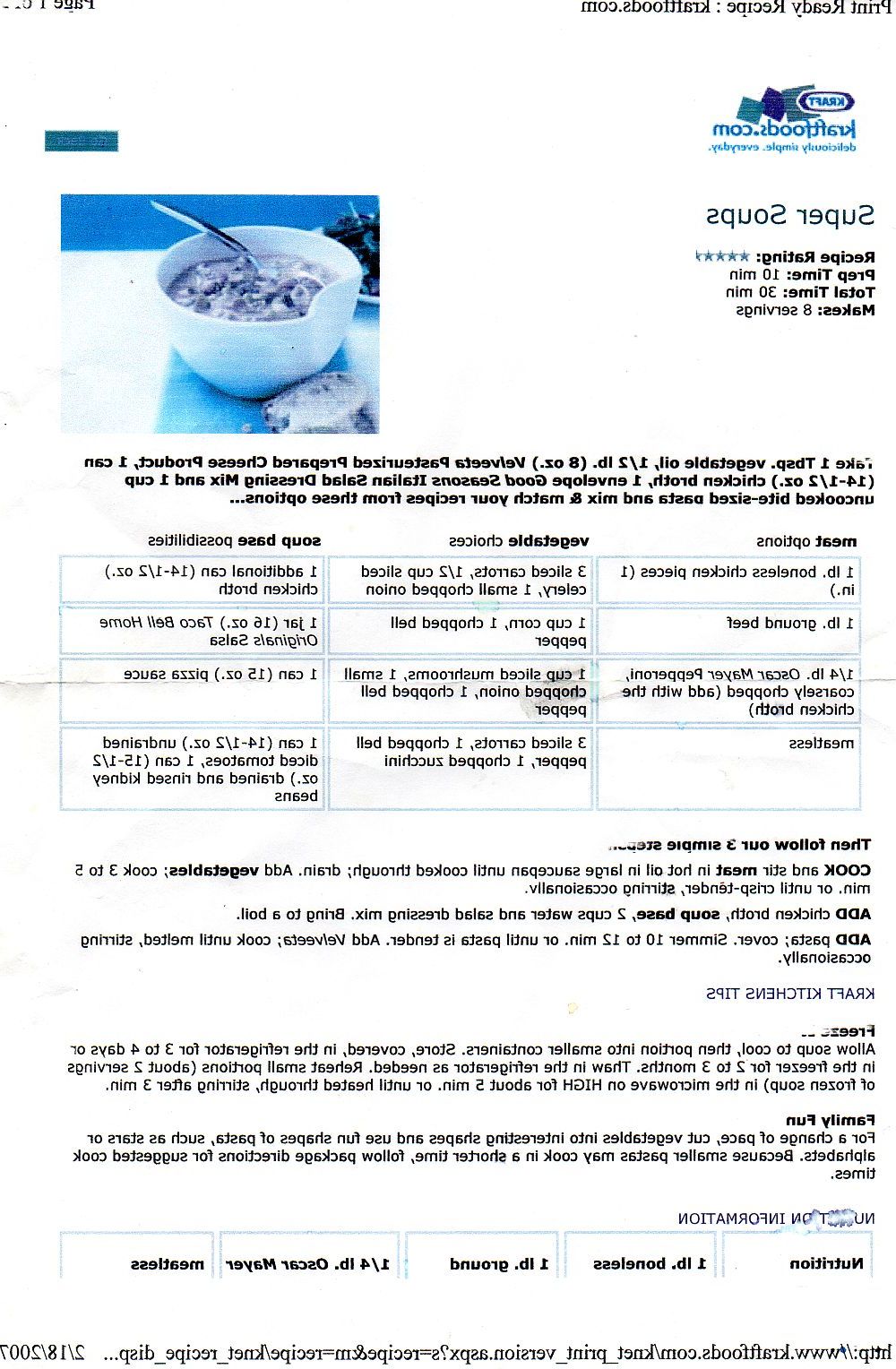 Deze heerlijke soep is perfect om in te vriezen, dus geniet van een warme, stevige maaltijd, zelfs op nachten dat er geen tijd is om er een te bereiden.Gewoon warm, serveer en geniet.Ik vond dit recept in Kraft Food And Family magazine.Ik heb dit recept nog niet geprobeerd , maar ik plaats het voor bewaring.