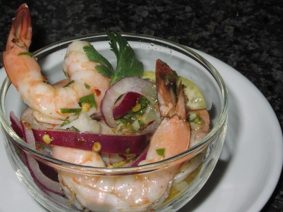 Nog een "California Sizzles" -recept. Probeer het nog niet, maar ik vind het een goed idee om eerst de garnalen te koken en deze vervolgens te bedekken met een pittige, citroenachtige marinade. Het wordt gekoeld geserveerd na minimaal 6 uur in de koelkast te hebben gemarineerd (niet inbegrepen in de voorbereidingstijd). Een eenvoudig en heerlijk aperitief.