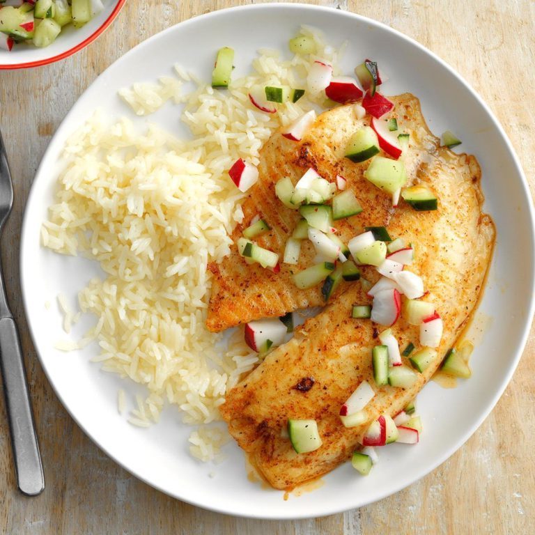 In Wyandotte, Michigan, vond Mary VanHollebeke een recept dat zelfs landrotten lokt voor haar vismaaltijden. "Ik zag dit gemakkelijke voorgerecht op een receptkaart in mijn lokale vismarkt," vertelt ze. "Hoewel mijn man niet groot is in vis, hij geniet van deze zacht smakende tilapia. " De smaak voegt een frisse tuinaroma en mooie kleur toe aan de licht gebruinde filets.