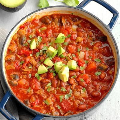 30 minGezond koken Receptenpaddestoel, ui, olie-, olie-, teentjes knoflook, vlees brokkelt af, bonen, tomaten, water, bouillon, Chili poeder, suiker, selderij zout, komijn, avocado, zure room,"hartig-y" veggie chili con carne -