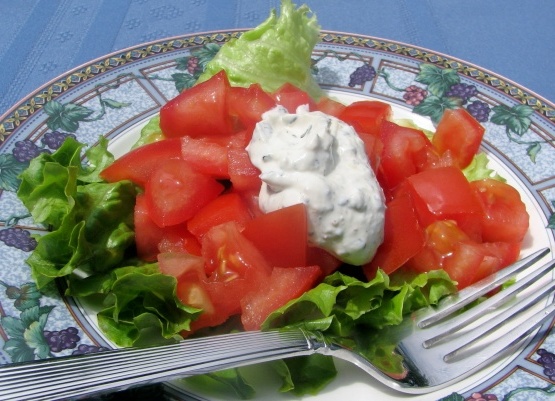 Hongaren willen hun tomaten graag "aankleden" met zure room en veel kaas. Dit is een afgeslankte versie.