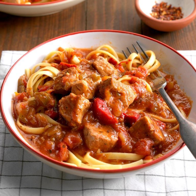 Tedere stukjes varkensvlees koken langzaam in een mooi gekruide, met wijn doordrenkte saus. Voeg wat gemalen rode pepervlokken toe voor een beetje toegevoegde kick. - Penny Hawkins, Mebane, North Carolina