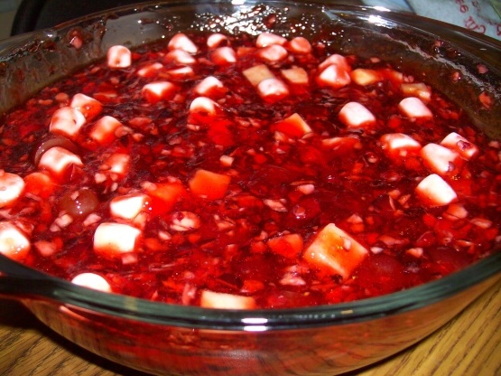 We genieten hiervan tijdens Thanksgiving en Kerstmis. Traditioneel wordt dit gemaakt met cherry Jell-O, echter, om een beetje gezonder te zijn, maak ik het nu met "geen suiker toegevoegd" vruchtensap. Voel je vrij om kersgelatine en water te vervangen (gemaakt om te verpakken aanwijzingen) in plaats van de niet-gelatineerde gelatine en vruchtensap. Hoewel veel genieten van de toevoeging van pecannoten, ik weglaten vanwege persoonlijke voorkeur.Als je jonge kinderen hebt, raad ik aan de appel te schillen. Als je een ongeschilde appel gebruikt, gebruik dan een rode appel voor de beste kleur.