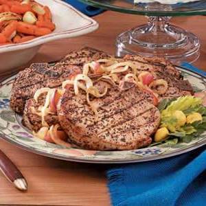 Ondertussen, in een grote koekenpan, bak uien en appels in boter tot ze gaar zijn. Roer bruine suiker erdoor; kook tot het verdikt en bubbelt. Serveer met varkenskoteletten.