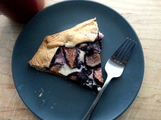 Nu ben je klaar om je taart te assembleren. Op een ingevette plaat pan, rol je korst uit om een ruwe ovaal of cirkel te vormen. Spreid dit uit met het ricotta mengsel, laat op een rand van 29 centimeter rond de rand (je vouwt op de taart). Sprenkel de helft van de bosbessen over de ricotta, verdeel dan gelijkmatig over je vijgen en strooi dan de andere helft van de bosbessen. Vouw de randen van de taart op om de zijkanten te bedekken. Ik hou van links in te vouwen en recht, vormen hoeken, vouw de bovenkant en onderkant naar boven. Maar dit is rustiek - vouw zachtjes naar wens, zodat de kaas en bessen niet in de pan zullen lekken.