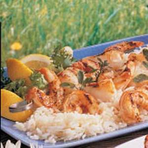 Gooi de marinade weg. Plaats garnalen en sint-jakobsschelpen op vier metalen of geweekte houten spiesjes. Bak ze, afgedekt, op matig vuur gedurende 5 minuten aan elke kant of tot de garnalen roze kleuren. Bewaar met rijst.