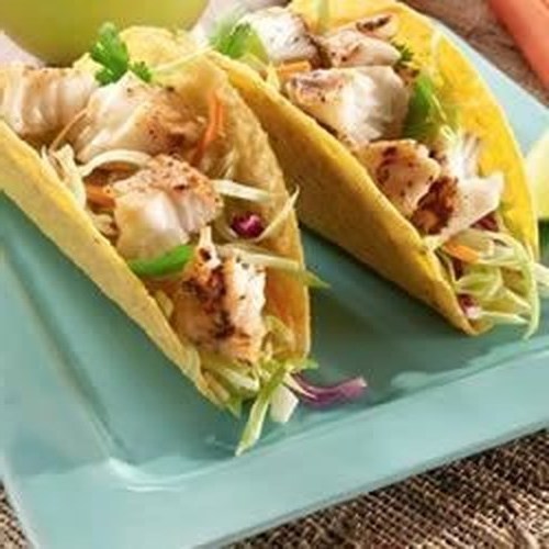 Breek vissen in hapklare stukjes. Vul elke taco schaal met koolsalam mengsel, vis en extra toppings.