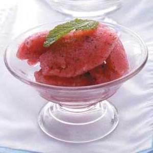 Doe de watermeloen en aardbeien in een blender; voeg suikerstroop toe.Verzorg en verwerk 2-3 minuten of tot het glad is.Rijn en gooi zaden en pulp weg.Verplaats puree naar een afmeting 13x9 inch.Vries 1 uur of totdat de randen beginnen te stollen.Roer in mint.Vries 2 uur langer of tot stevig