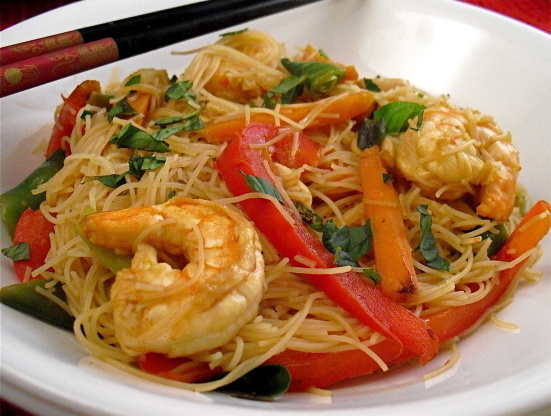 Dit recept begon als een kipsalade, maar ik wilde iets warmers en ik had rauwe groene garnalen thuis, dus het eindigde als een wokpan. Voor de noedels gebruikte ik Fresh Thai Noodles die geel van kleur en plat zijn, ik koop ze in het koelkastgedeelte van de supermarkt. Ik heb de volgende dag de wok gebraden voor de lunch en de smaken echt verbeterd. Geniet van