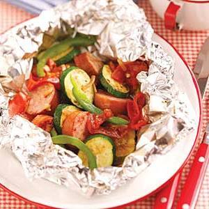 We hebben zoveel squash in de zomer, maar we zijn nooit moe van dit recept. We laten de worst vaak uit de foliepakketten en serveren de groenten als bijgerecht. Zelfs mensen die courgettes niet leuk vinden, genieten ervan.- Kay Bish, Thompsonville, Illinois