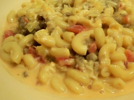 Ik ben dol op Mac en Cheese met tomaten. Met Rotel-tomaten krijg je een vleugje warmte en de worst verrijkt de andere ingrediënten.