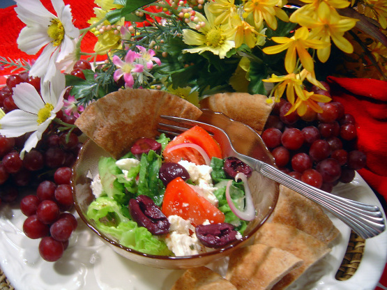 Meng tomaten, komkommer, ui en sla in een slakom; top met de olijven en fetakaas.