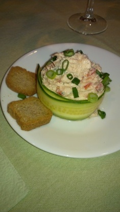 Spoon the mixture on a plate forming little balls and wrap it around with some cucumber slices.Bon Apetite!