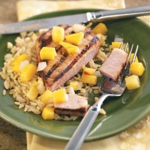 In blokjes gesneden mango en gehakte ui en ananas maken een frisse en fruitige topping voor deze makkelijke varkenskoteletten.Voor extra smaak voeg je gehakte koriander toe aan de salsa. - Pete Johnson, Chippewa Falls, Wisconsin