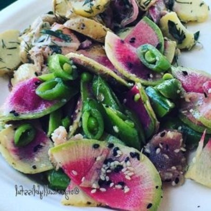 In een mengkom, gooi de gele courgette, snaps en watermeloen-radijs met sesamvinaigrette en dille.