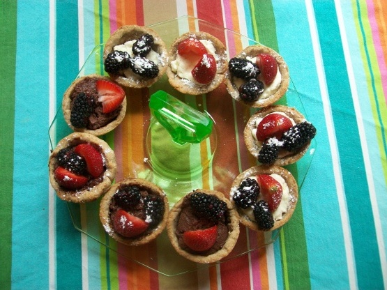 Plaats een eetlepel vulling in elke taartschaal en schik het fruit erop.