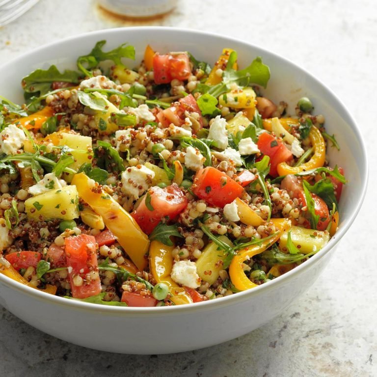 Breng de couscous en quinoa over naar de grote kom. Roer de overige ingrediënten van de salade erdoor. Klop de ingrediënten in een kleine kom tot ze zijn gemengd. Giet over de salade; zachtjes gooien om te coaten.