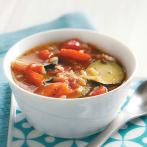 45 minItaliaanse soepknoflook, olie-, rijst, bouillon, peper, peper, wortels, zout, basilicum, rosmarijn, peper, courgette, tomaten,zomertuin groentesoep